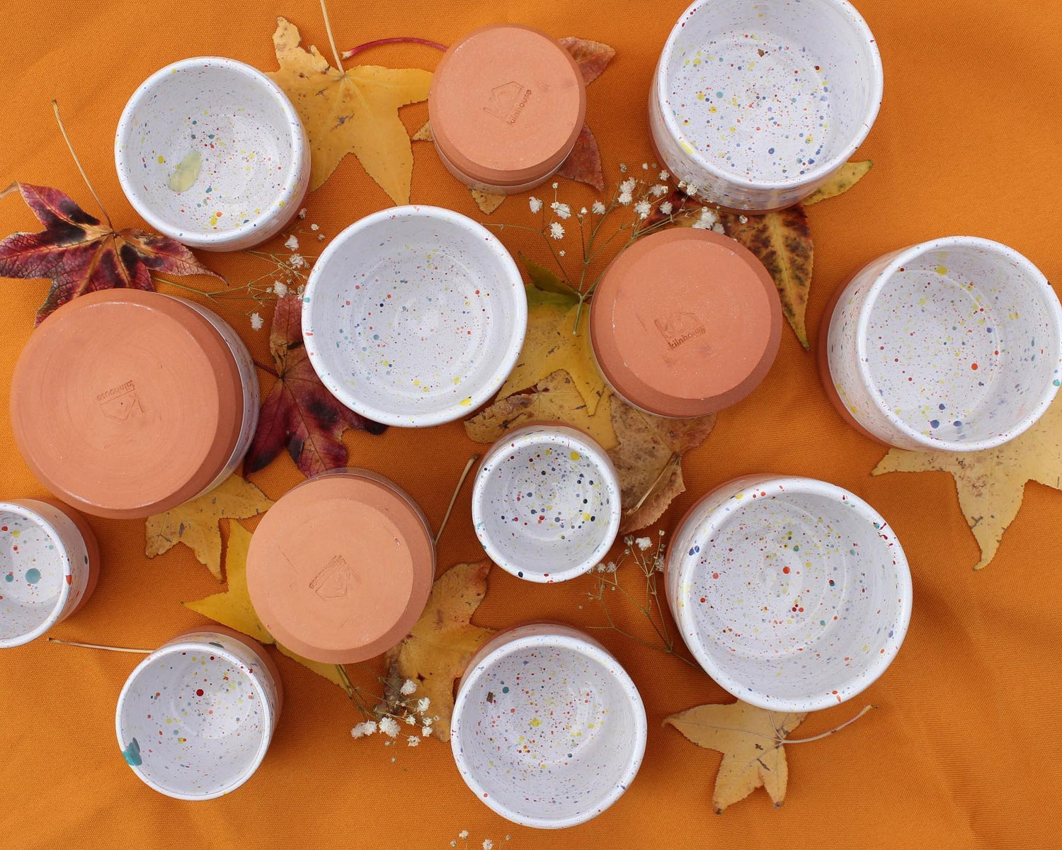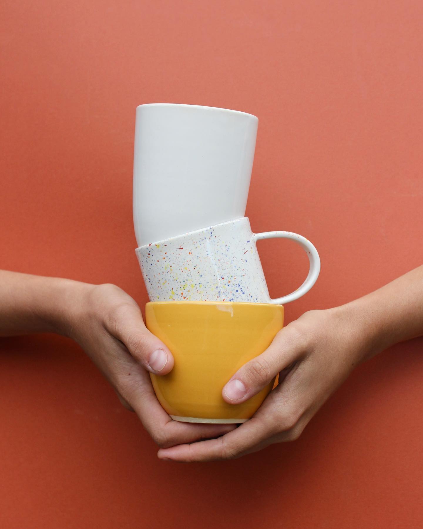 All vessels are hand-speckled with combinations of blues, reds, yellows and oranges making each a little unique, however similar in appearance. It’s like confetti, but functional!